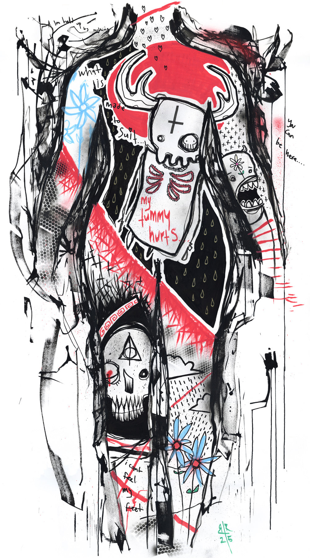 Raw, abstract, and unapologetically gritty, The Grim Ruiner of The Ruined Family Cult brings an experimental blackwork piece to the 2025 Made to Suit Collection. With 19 years of tattooing experience, this print—crafted using markers and spray cans—channels Brut Art and Abstract Noir into a visually chaotic yet captivating work.